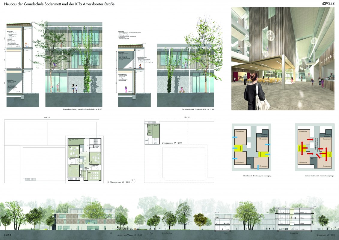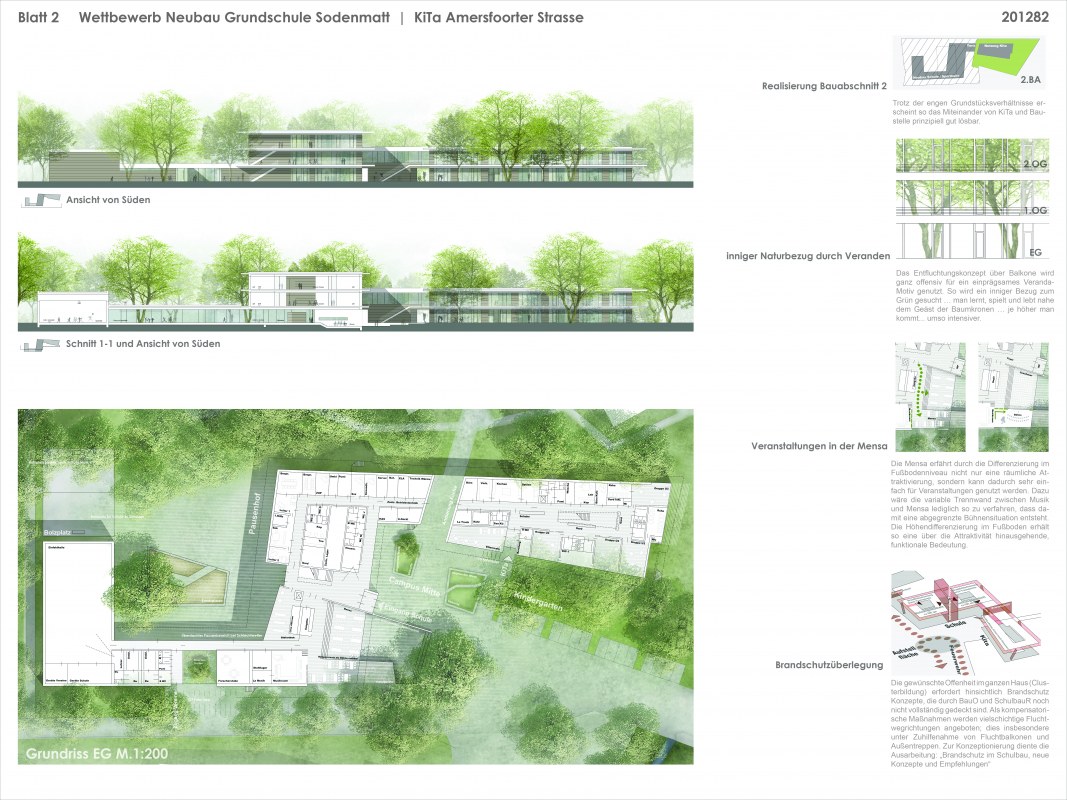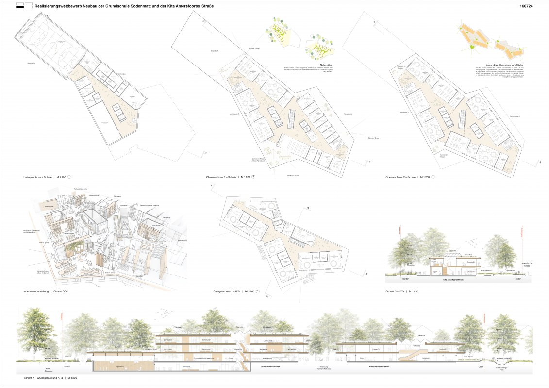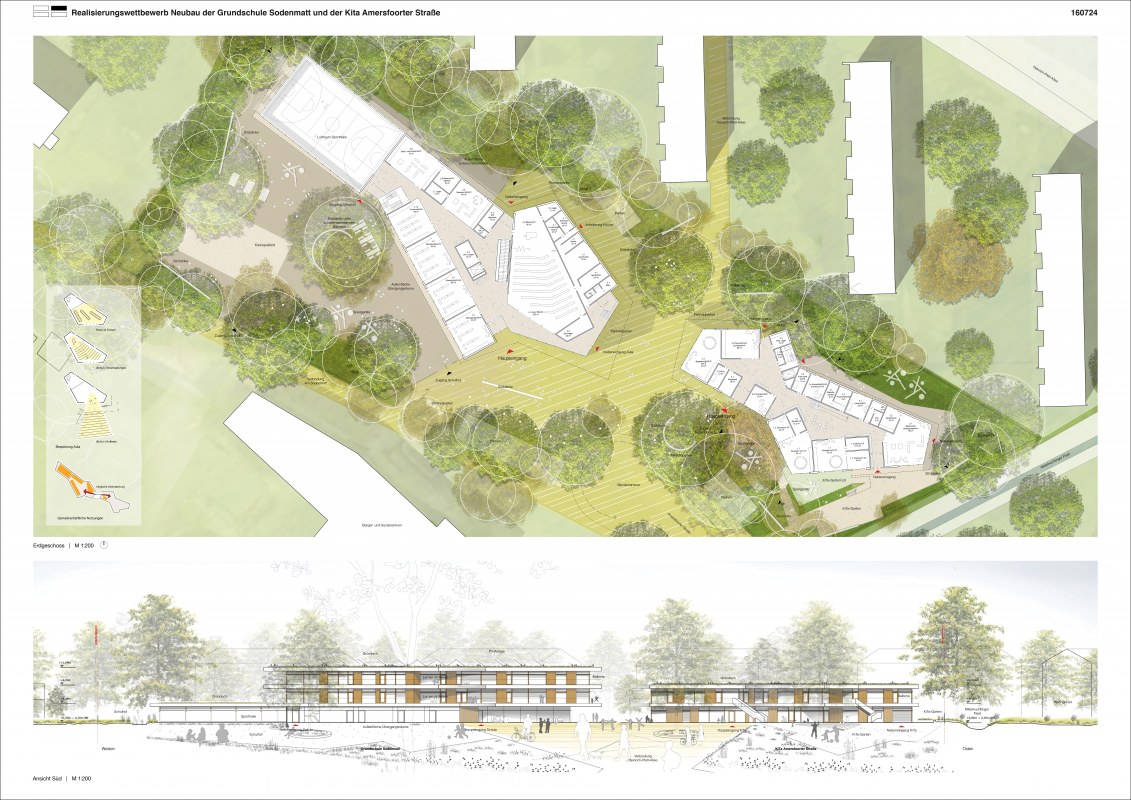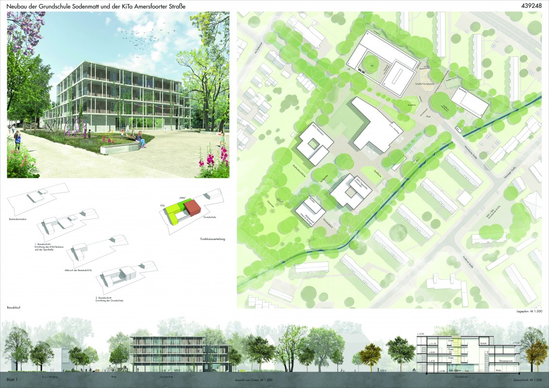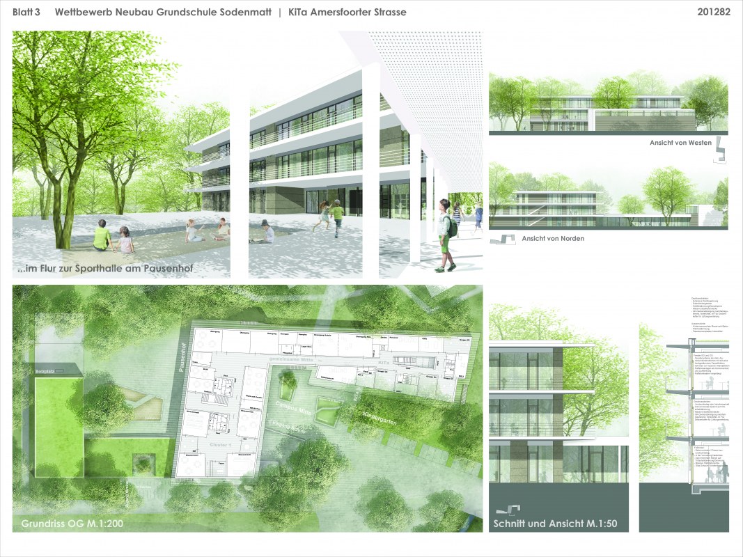 Neubau einer dreizügigen Grundschule mit Ganztagsangebot sowie einer achtgruppigen Kindertagesstätte und einer Sporthalle auf einem rund 9.920 m2 großen Grundstück im Bremer Stadtteil Huchting. Für den Neubau sollen insgesamt rund 5.830 BGF errichtet werden.