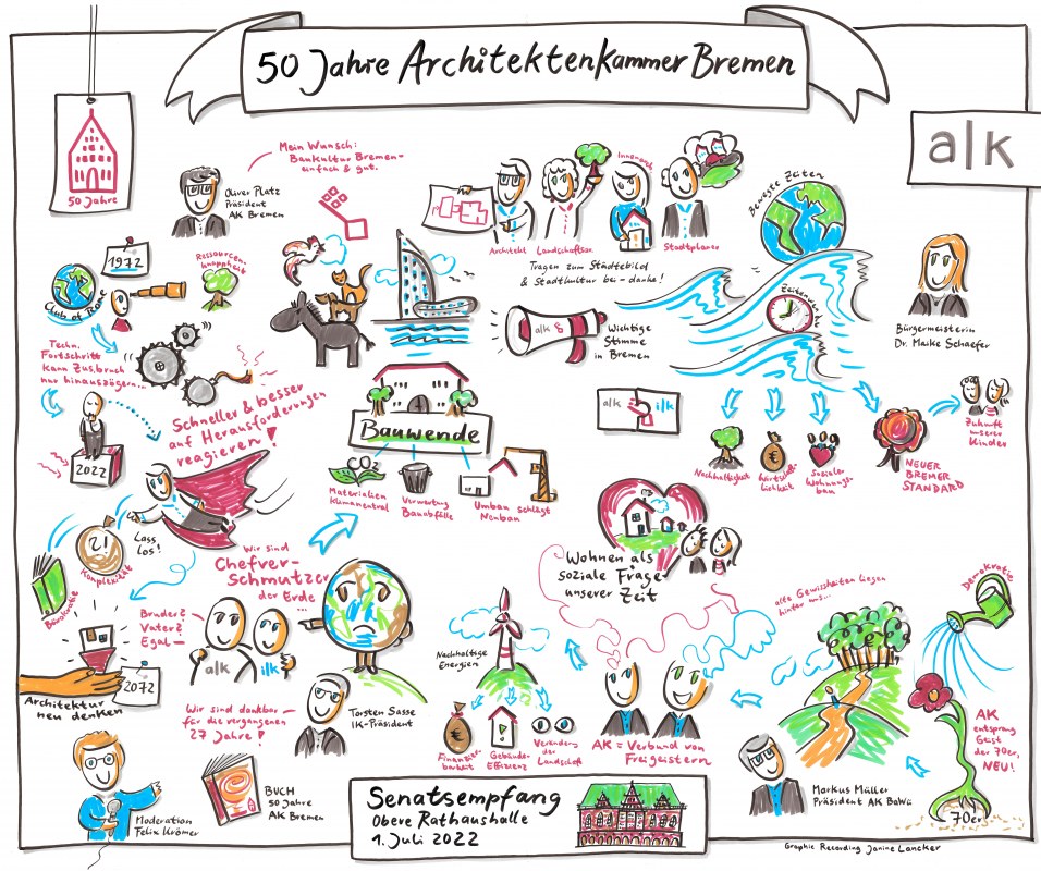 Am Freitag, den 01. Juli 2022, fand in der Oberen Rathaushalle eine Feierstunden anlässlich des 50-jährigen Bestehens der Architektenkammer Bremen statt. Die Senatorin für Klimaschutz, Umwelt, Mobilität, Stadtentwicklung und Wohnungsbau, Dr. Maike Schaefer, begrüßte die knapp 250 geladenen Gäste und betonte die Bedeutung, die die Architektenkammer Bremen heute hat: „Der Club of Rome hat 1972 seine Studie „Die Grenzen des Wachstums“ veröffentlicht. Heute, 50 Jahre später, ist die im gleichen Jahr gegründete Architektenkammer eine wichtige Partnerin auf unserer Seite, nicht nur architektonisch wertvoll, sondern auch sozial ausgewogen und vor allem energetisch nachhaltig in Bremen zu bauen. Mit ihren 1300 Mitgliedern hilft uns die Architektenkammer, qualitätsvolle Bauwerke, Stadträume, Innen- und Außenbereiche sowie Landschaften zu gestalten und damit ganz wesentlich zur Lebensqualität, zur Funktionsfähigkeit und zu kulturellen Identität - kurz: zum Bild unseres Zweistädtestaates mit Bremen und Bremerhaven beizutragen. Das möchte ich im Namen des Bremer Senats ganz ausdrücklich würdigen und mich für das Engagement über ein halbes Jahrhundert hinweg bedanken!“