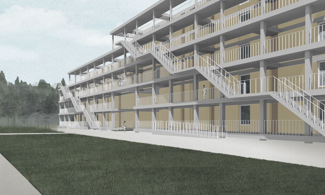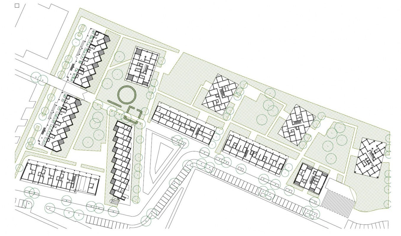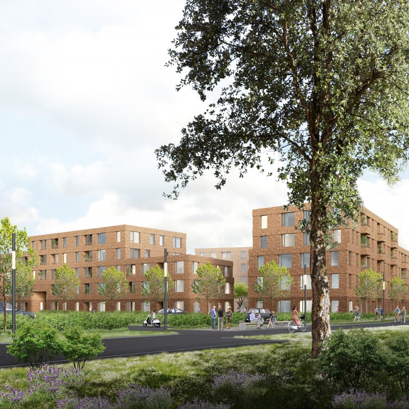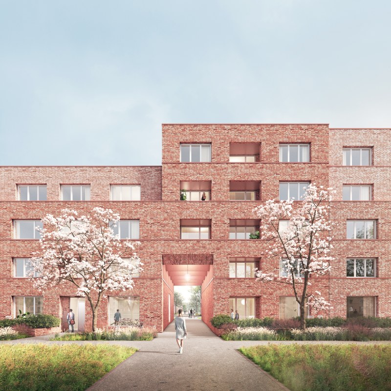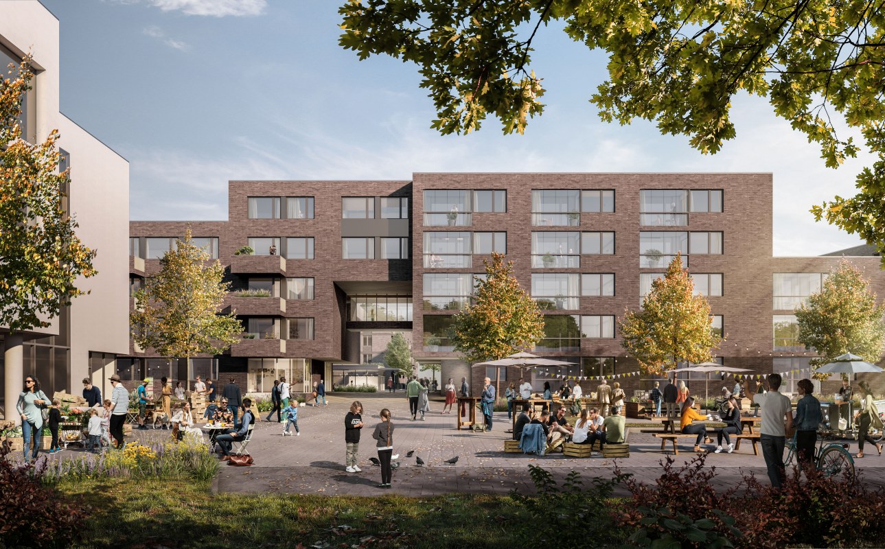 Im Jahr 2009 wurde ein städtebaulicher Rahmenplan als Grundlage für das Sanierungsgebiet Huckelriede erstellt. Für das Kasernengebiet wurden damals bereits erste Bebauungskonzepte entwickelt und im Januar 2011 ein Aufstellungsbeschluss für den Bebauungsplan Nr. 2417 gefasst. Die Neu-gestaltung des Niedersachsendamms ist prägend für das neuentstehende Scharnhorst-Quartier. So auch das hier neuentstandene Quartierszentrum, das Cambrai-Dreieck in näherer Umgebung, ebenfalls ein Projekt der GEWOBA. Das Wohngebäude mit Kindergarten, Stadtteilcafé, Veranstaltungsräumen, betreutem Wohnen und kleinen Büros spiegelt den Wunsch der Bürger*innen nach einem neuen Treffpunkt wider.