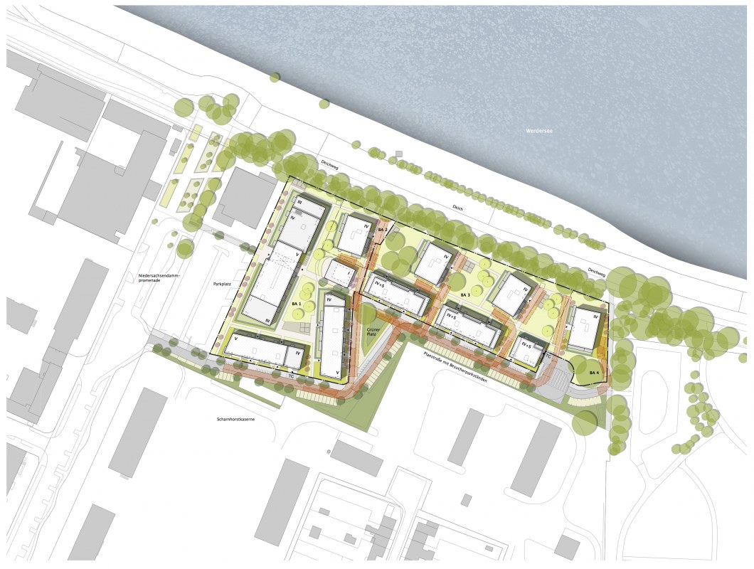 In einem hochbaulichen Realisierungswettbewerb mit Ideenteil werden im Realisierungsteil für den Bauabschnitt 1 (geförderter preisgebundener Wohnungsbau) und 2 (preisfreier Wohnungsbau) und im Ideenteil für die Bauabschnitte 3 und 4 (preisfreier Wohnungsbau) qualitativ hochwertige Grundriss-Lösungen für die unterschiedlichen Wohnbausteine gesucht. Insgesamt sollen etwa 24.000 m² BGF für Wohnnutzungen an diesem besonderen Standort am Wasser entstehen. Dabei wird eine Mischung von 2-Zimmer-Wohneinheiten (WE) bis 4- und mehr-Zimmer-Wohnungen angestrebt; der Schwerpunkt der Wohnungsgrößen soll auf 2- bis 3-Zimmer-WE liegen. Des Weiteren soll eine eigenständige und qualitätvolle Gestaltsprache für das Scharnhorst-Quartier gefunden werden, die mit dem im Rahmen des Bebauungsplans entwickelten Freiraumkonzept korrespondiert.