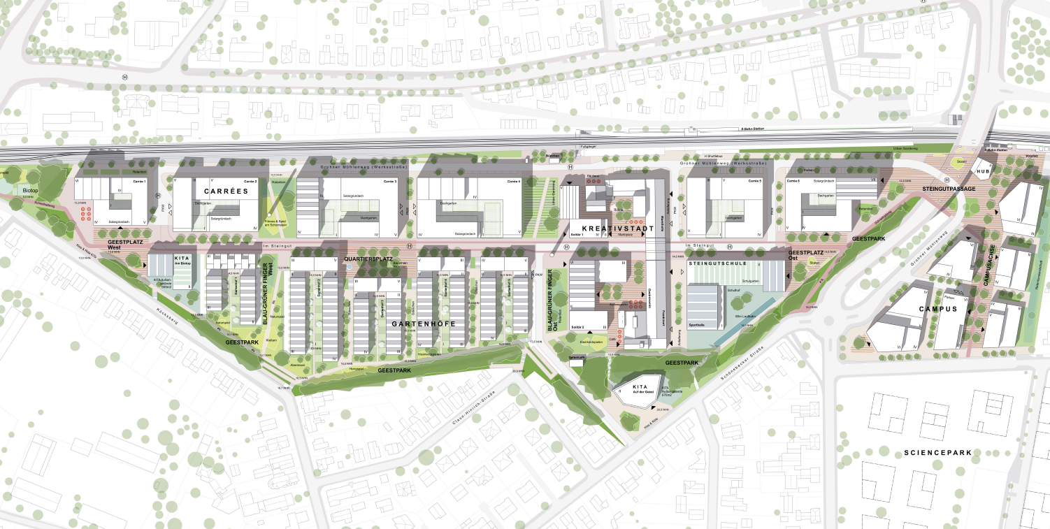 Der ehemalige Industriestandort der Norddeutschen Steingut soll zu einem gemischt genutzten, nachhaltigen und urbanen Stadtquartier umgewandelt werden. Im Rahmen der Wohnbauoffensive und innerstädtischen Entwicklung soll dieser städtebauliche und freiraumplanerische Wettbewerb in Form einer Quartiersplanung als Grundlage zur Entwicklung des Bebauungsplans dienen.